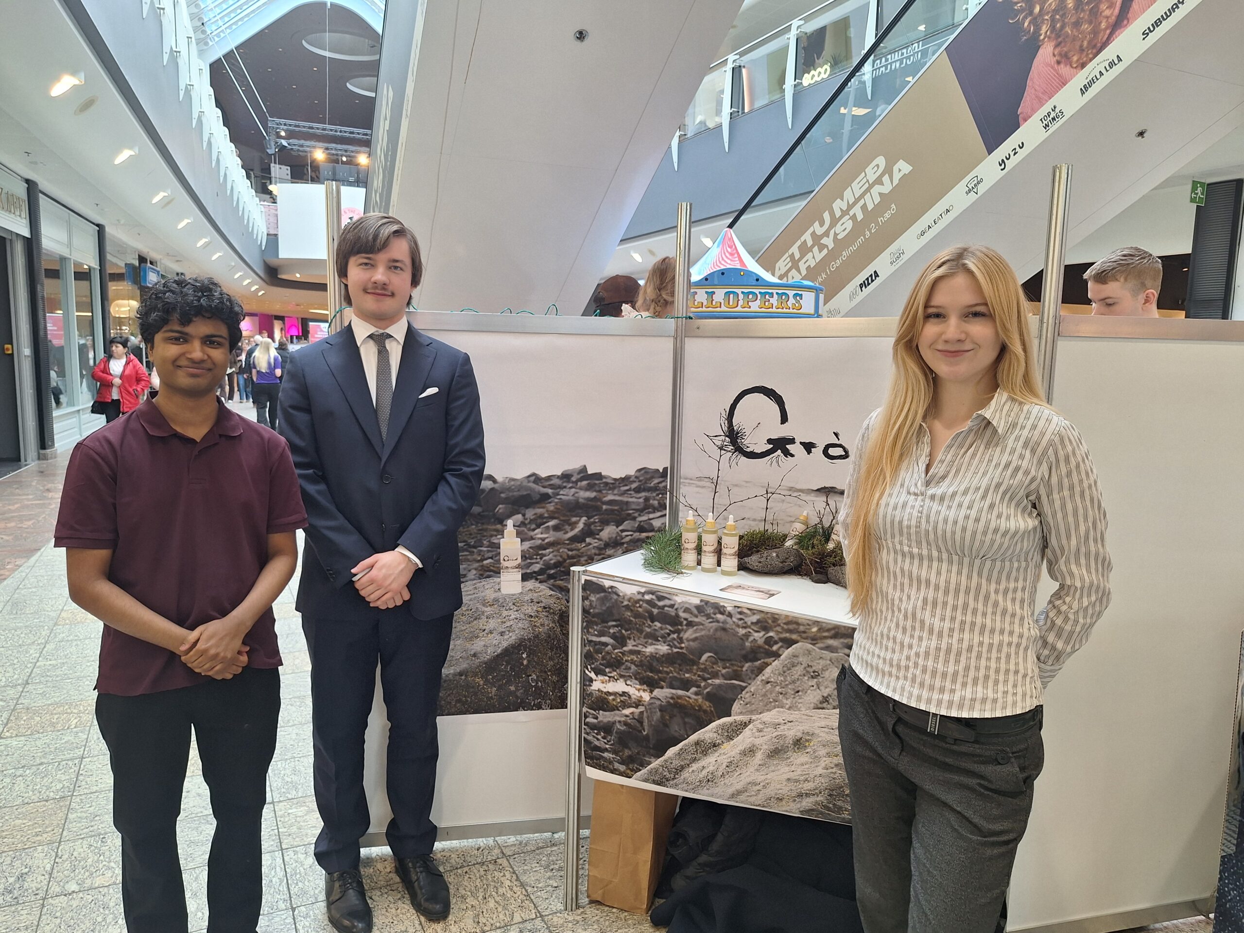 Í dag eru þrír hópar af nemendum úr MR að kynna vörur sínar á vörumessunni Ungir frumkvöðlar sem haldin er í Smáralind. Þessir nemendur eru búnir að vera að hanna og þróa vörur sínar í áfanganum Fyrirtækjasmiðjan.